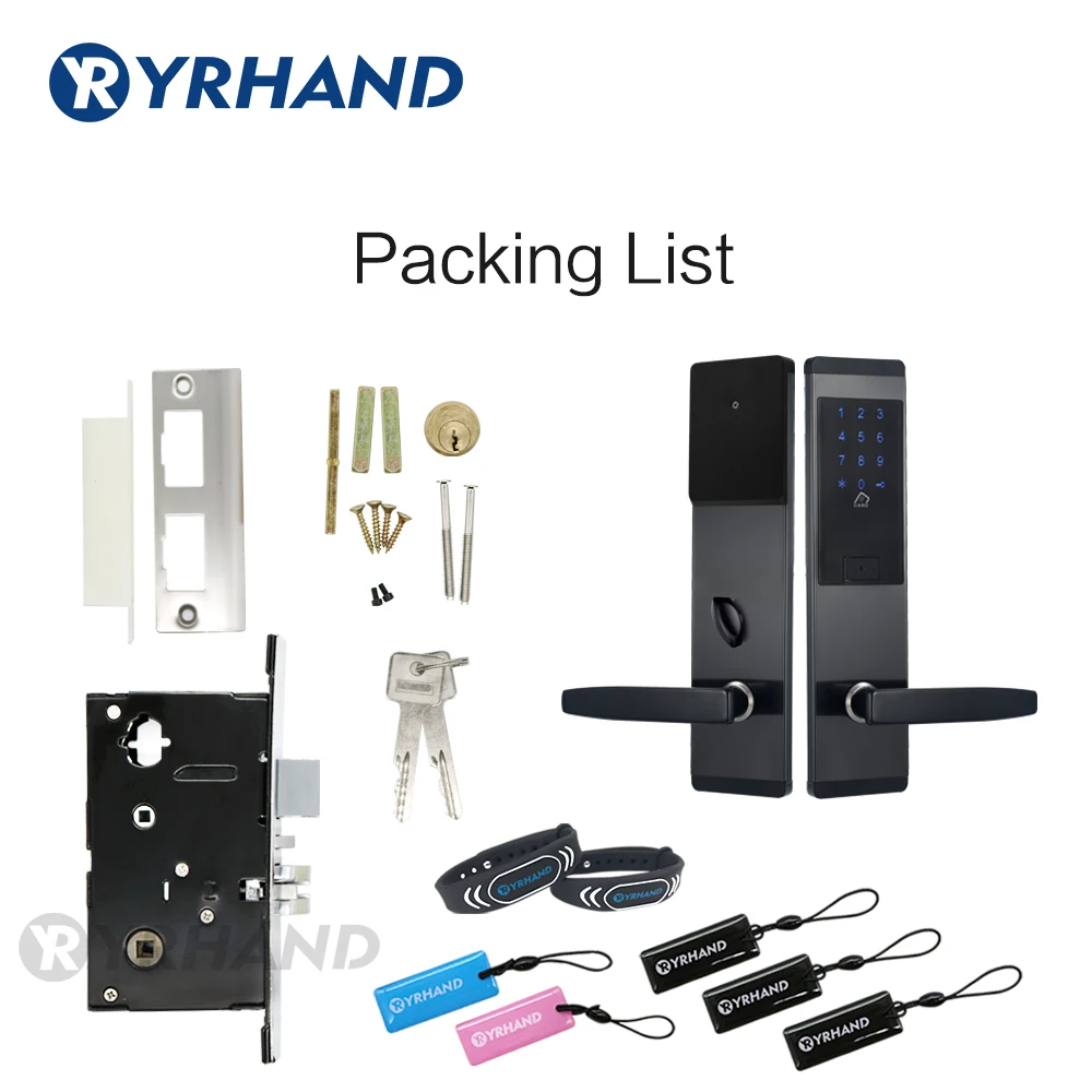Front panel x 1 Rear panel x 1 Mortise lock x 1 Smart card x 5 M1 Wristbands: x 2Mechanical Key x 2 Screw Kit x 1