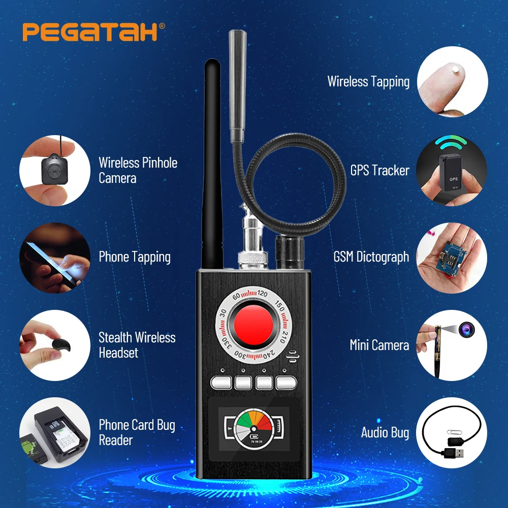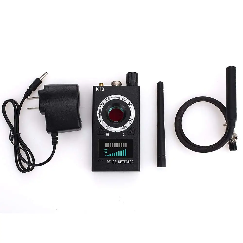 etection mode: 1. detection, 2. Vibration (Mute) detection, 3. Beep detection, 4 LED display A detection. 5. Headset.Low voltage indication, built-in rechargeable battery.There is a small compass below the front of the product, blue light background, easy to indicate the direction.Material: ABSColor: BlackWireless Sweep: frequency detection range (1MHz-6 5GHz)Ddetection Camera distance of 10cm-10m (the naked eye can identify red flashing)sedio detection of camera range 5cm-l0m(subject to the transmitting power of RF device)Power in the 50mv-200mv detection range 30-50cmPower in the 300mv-600mv detection range 100-200cmPower in the 80gray-1200my detection range 300-800cmPower supply: Built-in lithium polymer battery 450mAHCurrent Consumption: 8mASelf-shoot detecting wave length: 920nmReceive frequency range: 1MHz-6500MHzSpecial dedicated optical lens filters