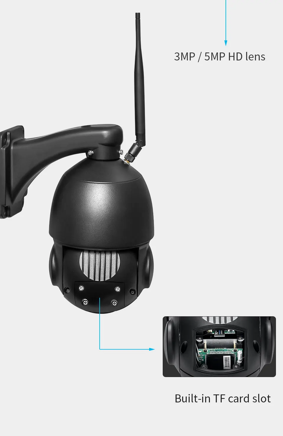 Hi3516E+ IMX307 SensorSupport HD 1080P High Quality ResolutionSupport TF/Micro SD Card, up to 128G(Don't included SD/TF Card)30x Optical Zoom Auto Focus Lens(optional)Pan Tilt Rotation, Horizontal:355 degrees & Vertical:90 degrees8pcs Array Infrared LEDs 20-80m Night VisionSupport P2P, View & Anywhere & AnytimeProvide Android & IOS APP (CamHi) and professional CMS PC client softwareABS Plastic + Metal Housing Material,Outdoor Use,Waterproof IP66Support 2-Way AudioDay&Night mode: Auto IR-CUTVoltage: DC 12V 2ASupport IR Night VisionSupport Motion DetectionApp: CamHi/CamHiproPackage included: