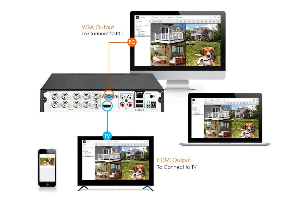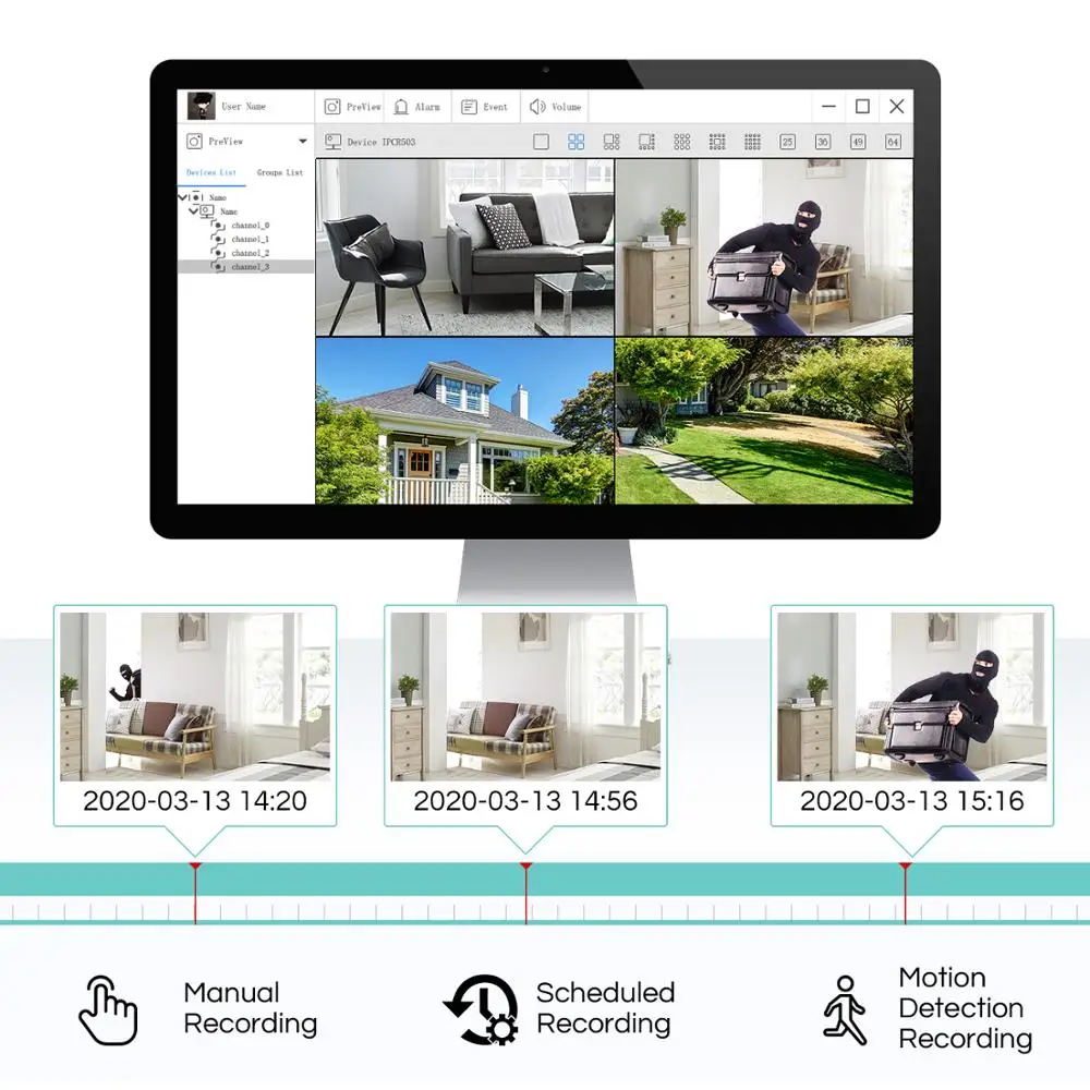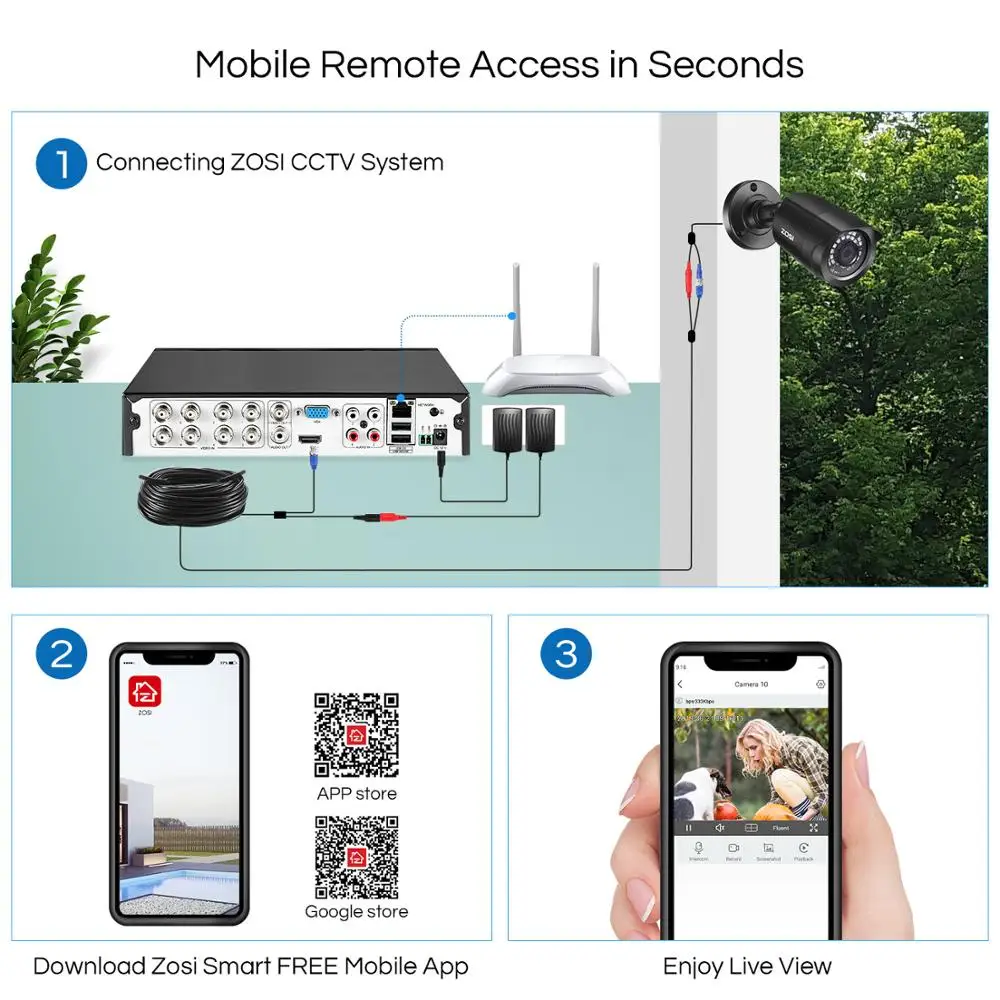 Lower Bandwidth Less Storage Space Better Image Quality You can set motion detection zones and focus on important areas like doors or windows, and get motion clip alerts only when something happens there. Alsocan reduce the number of unnecessary alarms. Local Viewing: No Network needed, just connect the system to a monitor via HDMI/VGA port. Remote Viewing: Download the Zosi Smart app on your smartphone (iOS or Android), and enjoy four cameras simultaneous viewing on the app. You could also view the live view on computer via AVSS PC client. Watch recordings saved on DVR remotely via Zosi Smart app. You can watch them on your mobile devices anytime anywhere,You can using mobile network or WiFi.Playback locally on your large screen HD-TV by using the HDMI port on the DVR. ZOSI DVR offers 4 kinds recording modes to meet your needs: Continuous Record ; Scheduled Record; Motion Detect Record; Recycle Record.You can customize each camera with different recording modes, which allows you to save space on the hard drive